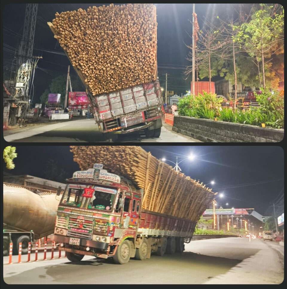 జామాయిల్ కర్ర లోడుతో వెళ్తున్న లారీ వల్ల ప్రజలకు తృటిలో పెను ప్రమాదం తప్పింది.